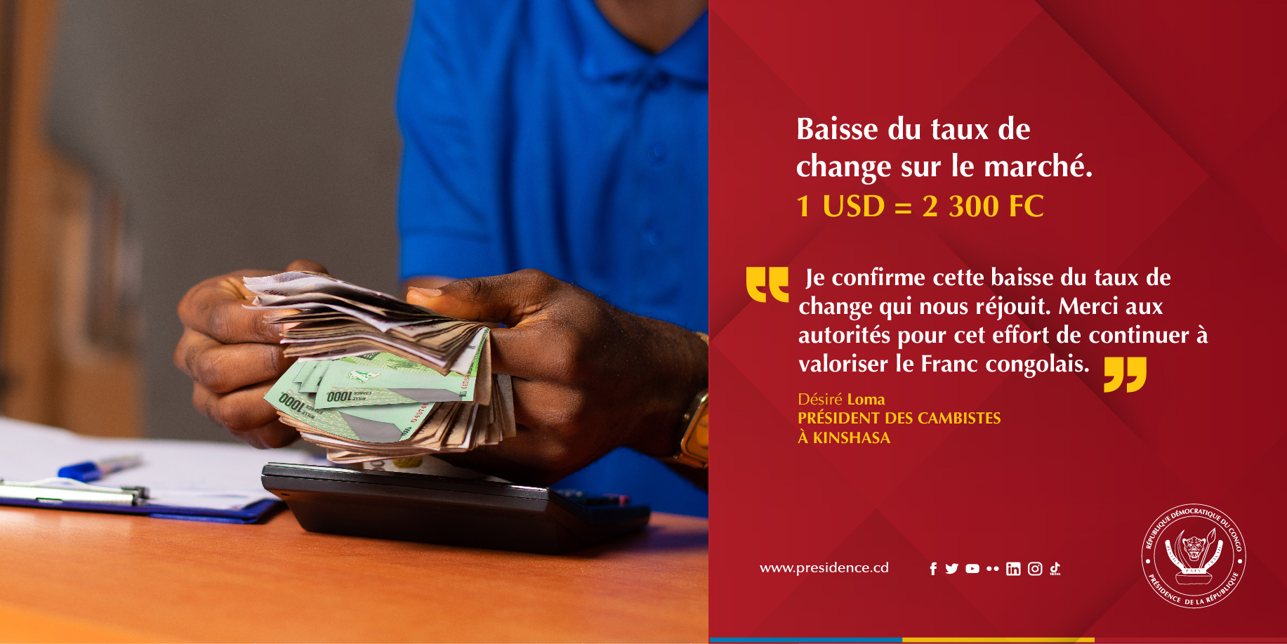 Ce dimanche 30 juillet, 1 dollar américain vaut 2 300 Franc congolais (FC). Il se négociait jusqu’à 2 600 FC il y a quelques jours. « Je confirme cette baisse du taux de change qui nous réjouit. Merci aux autorités pour cet effort de continuer à valoriser le Franc congolais », a déclaré à la presse présidentielle Désiré Loma, Président des cambistes de Kinshasa.