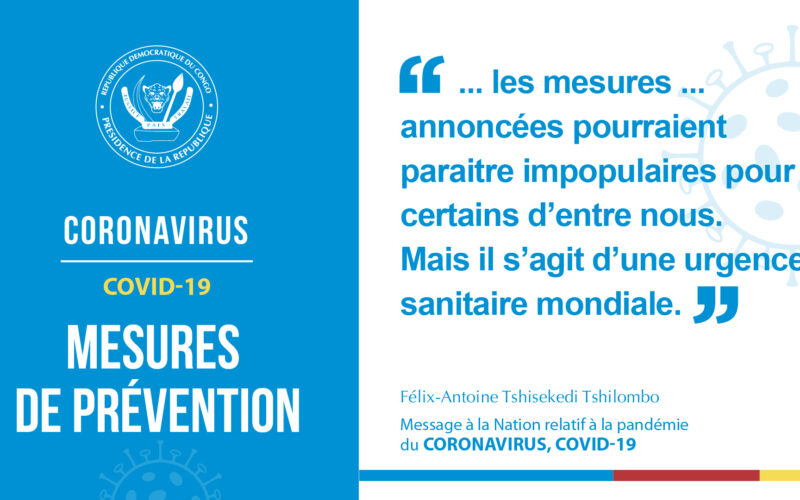 Suite à son adresse à la nation de ce 18 mars 2020, voici les décisions prises ce mercredi 18 mars 2020 par le Chef de l’État Son Excellence Monsieur Félix-Antoine Tshisekedi Tshilombo, au sujet de l’épidémie au Coronavirus-COVID-19.