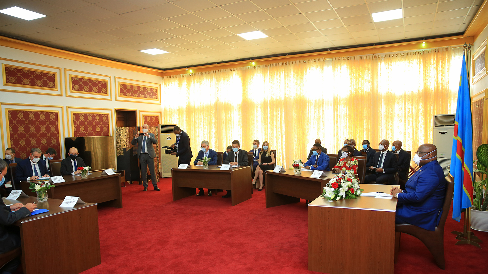 Le Chef de l’Etat, S.E.M Félix-Antoine Tshisekedi, a reçu en audience le lundi 8 juin 2020, Janez Lenarčič, Commissaire européen chargé de la gestion des crises, Philippe Goffin, ministre belge des affaires étrangères et de la défense et Jean-Yves Le Drian, ministre français de l'Europe et des affaires étrangères. Ces trois personnalités européennes de haut niveau sont en visite officielle en RDC dans le cadre du « Pont aérien humanitaire » initié par la Commission européenne, la Belgique, la France et les organisations d’aide humanitaire, en coopération avec les autorités congolaises, pour soulager, tant soit peu, la crise sanitaire qui sévit en RDC suite à la pandémie de coronavirus.