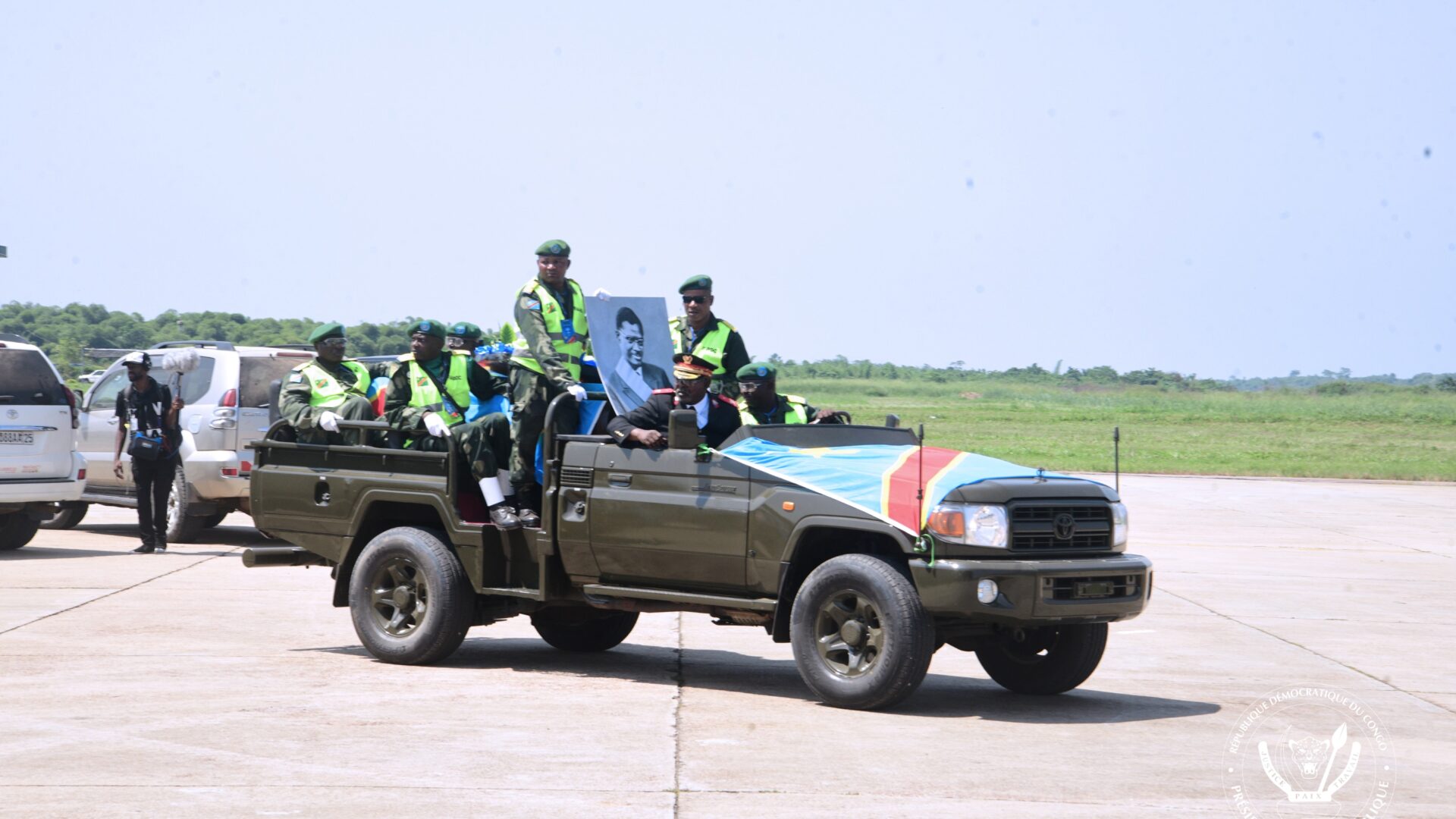 A l'aéroport de Bangoka, l'atmosphère était plutôt pesant, tranchant avec la bruyance qui avait caractérisé les deux jours de funérailles. Pas de discours, si ce n'est le petit mot prononcé par le Représentant du Chef de l'Etat, le Prof. Modeste Bahati Lukwebo, devant la dépouille du Héros national immobilisée sur le tarmac et recouverte du drapeau national.