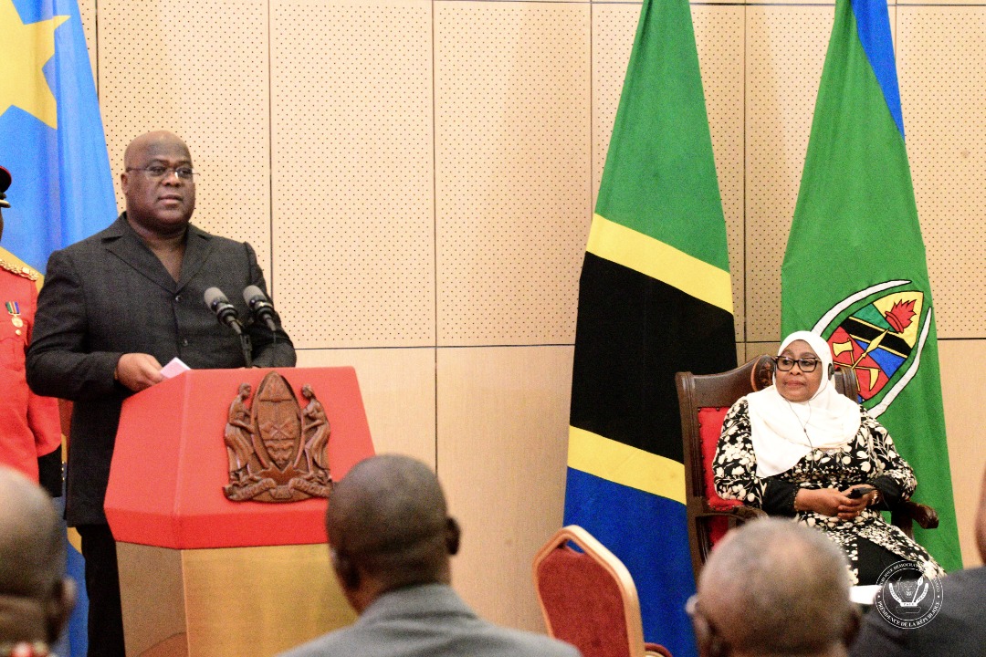 En présence des présidents Félix Tshisekedi et Samia Suhulu Hassan, le Vice-premier ministre des affaires étrangères Christophe Lutundula et son homologue de Tanzanie ont signé, ce dimanche au State House de Dar-es Salam deux mémoranda d'entente ( MOU) dans les secteurs de transport et des télécommunications. C'est  la matérialisation de l'engagement des deux chefs d'Etat pris à Kinshasa en août dernier à l'occasion de la visite d'Etat de la présidente Samia Suluhu Hassan. Dans le secteur des transports, par exemple, les deux présidents ont confirmé au cours du point de presse qui a suivi cette signature , leur volonté de construire un chemin de fer devant relier la Tanzanie, le Burundi et la RDC ainsi qu'une route entre la Tanzanie et la RDC. Arrivé ce dimanche 23 octobre à Dar-es-Salam sur invitation de son homologue de la République  Unie de Tanzanie, le Président Félix Tshisekedi Tshilombo a été accueilli par un cérémonial d'une visite d'Etat. La présidente Suluhu Hassan a fait le déplacement de l'aéroport international Julius Nyerere pour accueillir son hôte de marque venu pour une visite d'Etat de 48 heures .Les deux chefs d'Etat ont eu une première rencontre en tête-à-tête avant d'élargir les archanges avec leurs délégations respectives. Devant la presse, les présidents  Félix Tshisekedi et Samia Suluhu Hassan ont affirmé que les échanges bilatéraux ont porté sur la volonté des deux pays voisins à redynamiser les relations bilatérales dans plusieurs secteurs notamment la sécurité,