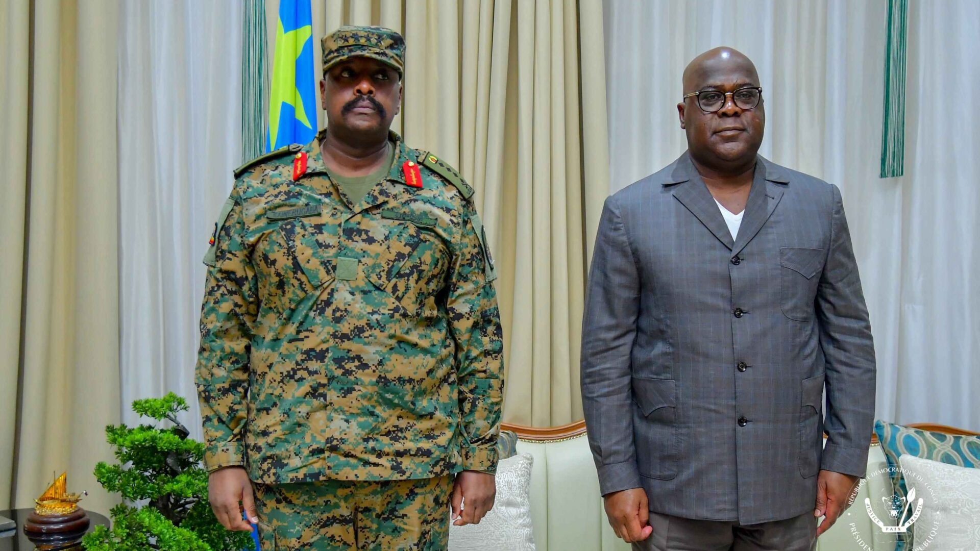 Profitant de sa présence dans la capitale congolaise, dans le cadre de l’évaluation de l’opération militaire conjointe FARDC-UPDF avec son homologue congolais le Général Jules Banza Mwilambwe,  le Chef d’État-major ougandais est venu présenter ses civilités au Président Félix Tshisekedi, Commandant suprême des Forces armées de la République Démocratique du Congo (FARDC).