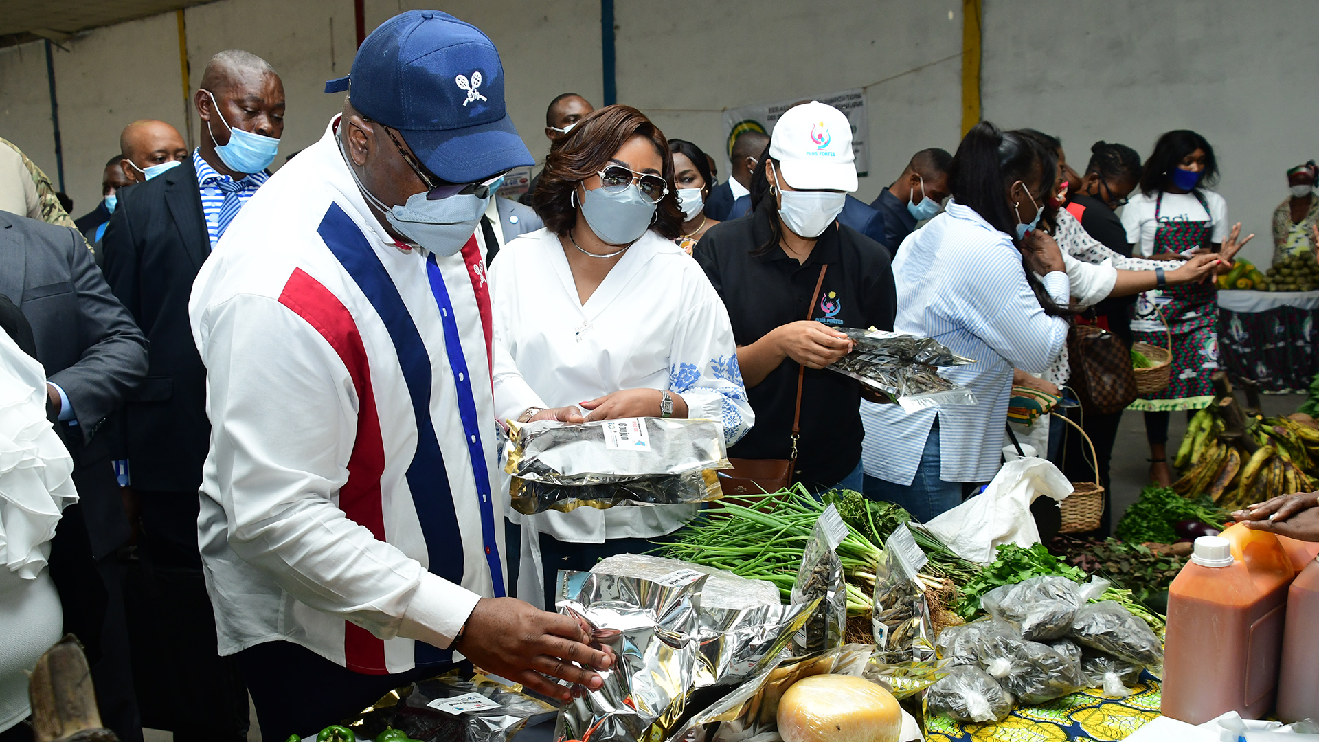 Le Président de la République, S.E.M Félix-Antoine Tshisekedi Tshilombo, accompagné de la Distinguée Première Dame, Denise Nyakeru Tshisekedi, s’est rendu au Pavillon 17 de la Foire internationale de Kinshasa pour visiter le "Marché Du Samedi" où sont vendus, chaque samedi de la semaine, des produits agricoles, d'élevage, de pêche et de transformation.