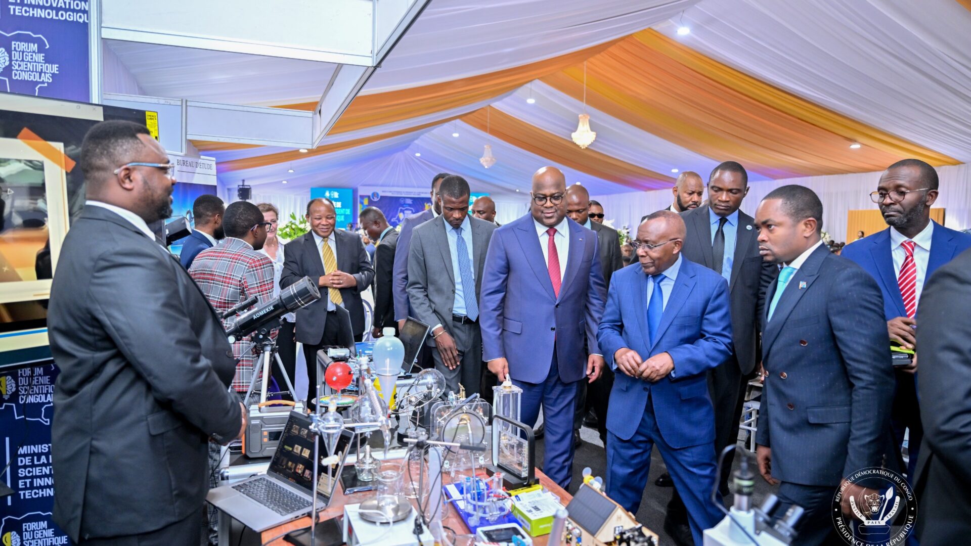 Ce jeudi au chapiteau du Palais du peuple, le Chef de l’État Félix Tshisekedi a présidé la cérémonie de clôture de la deuxième édition du Forum du génie scientifique congolais. Le Président de la République a visité les stands des inventeurs / innovateurs, avant de remettre les médailles aux lauréats.