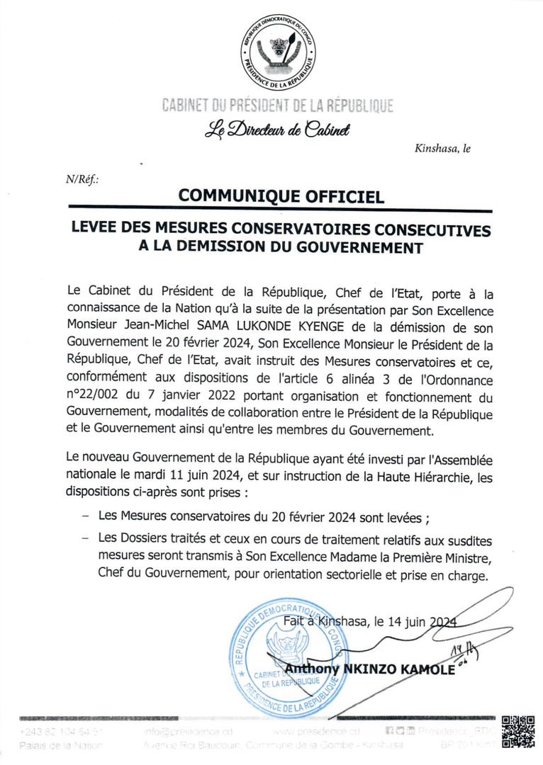 Le Cabinet du Président de la République, Chef de l'Etat, porte à la connaissance de la Nation qu'à la suite de la présentation par Son Excellence Monsieur Jean-Michel SAMA LUKONDE KYENGE de la démission de son Gouvernement le 20 février 2024, Son Excellence Monsieur le Président de la République, Chef de l'Etat, avait instruit des Mesures conservatoires et ce, conformément aux dispositions de l'article 6 alinéa 3 de l'Ordonnance n°22/002 du 7 janvier 2022 portant organisation et fonctionnement du Gouvernement, modalités de collaboration entre le Président de la République et le Gouvernement ainsi qu'entre les membres du Gouvernement.