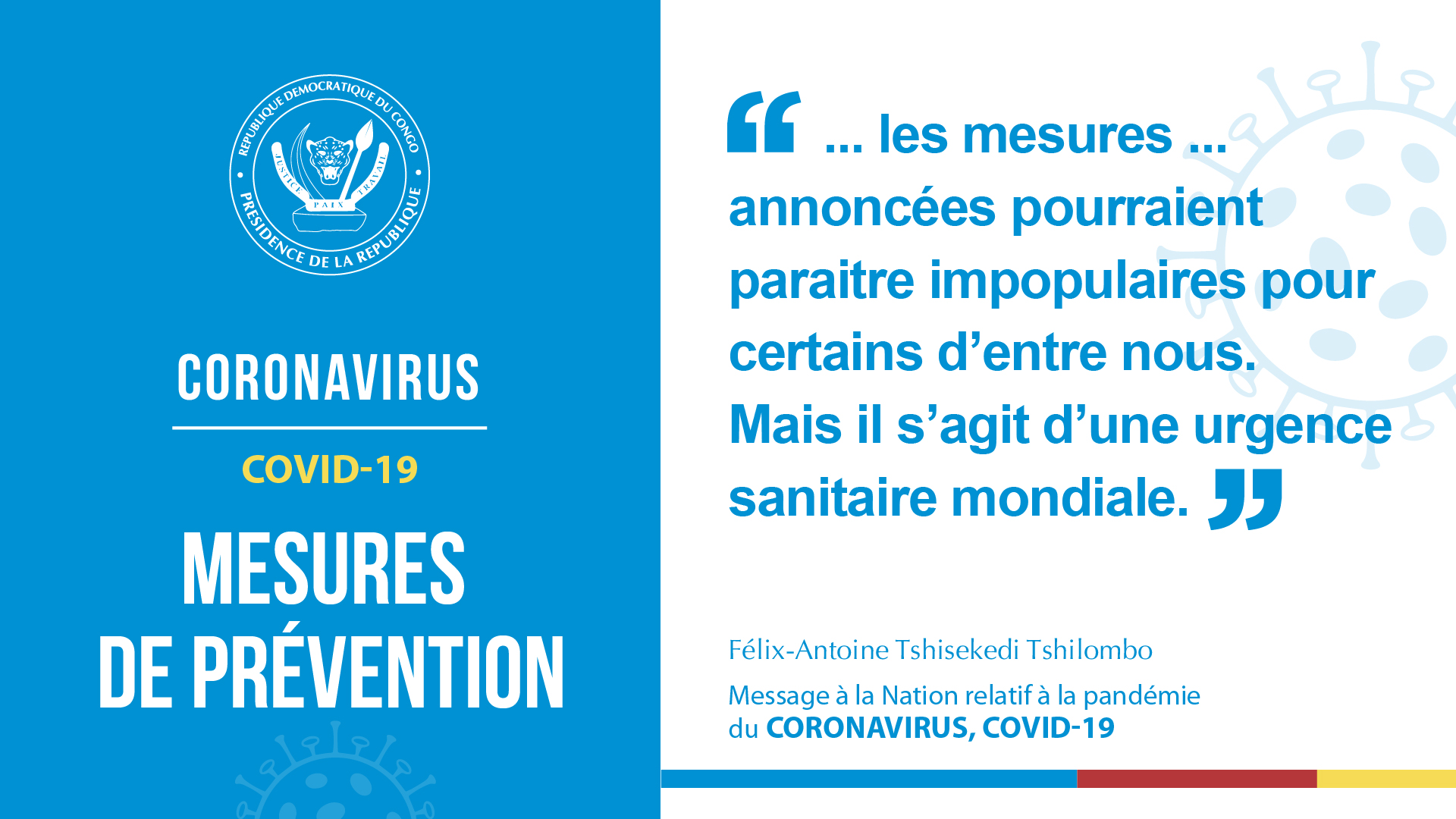 Suite à son adresse à la nation de ce 18 mars 2020, voici les décisions prises ce mercredi 18 mars 2020 par le Chef de l’État Son Excellence Monsieur Félix-Antoine Tshisekedi Tshilombo, au sujet de l’épidémie au Coronavirus-COVID-19.