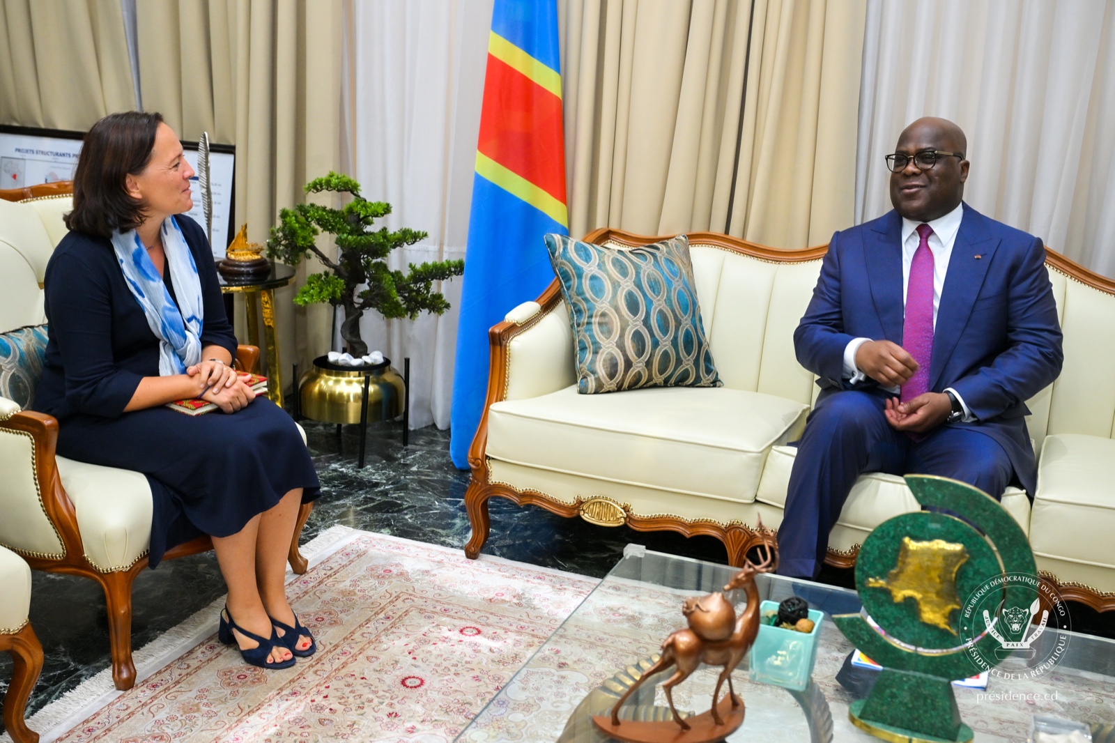 Le Chef de l’État a reçu, ce jeudi à la Cité de l’Union africaine, l’Ambassadrice de Belgique en République Démocratique du Congo (RDC) Roxane de Bilderding. Plusieurs sujets relevant des relations bilatérales entre les deux pays parmi lesquels la question des investissements économiques figuraient à l’ordre du jour.