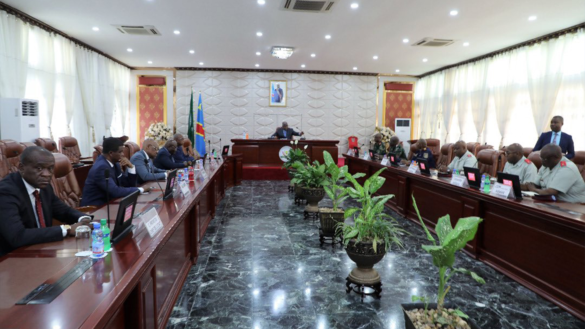 Le président de la République, Félix-Antoine Tshisekedi Tshilombo, a présidé ce jeudi 21 novembre, en sa qualité de Commandant Suprême de la police et desforces armées de la République démocratique du Congo, le conseil de sécurité, dans la grande salle de réunion de la Cité de l'Union Africaine. Le Premier MinistreSylvestre Ilunga Ilunkamba, le ministre de la Défense Aimé Ngoy Mukena, ainsique les généraux représentant la haute hiérarchie de l’armée nationale dont le Chefd'Etat-major général adjoint Gabriel Amisi Kumba dit « Tango Four », ont pris partà cette réunion stratégique. Cette rencontre a porté essentiellement sur la situation sécuritaire globale du pays,notamment celle de Beni où des nouvelles tueries de civils ont été enregistrées cesderniers jours. Le Chef de l'État, Félix-Antoine Tshisekedi, a donné des instructionsclaires à ce sujet tendant à mettre fin à ces massacres qui endeuillent régulièrementla population de cette partie du pays.A l’issue de:la réunion, les responsables militaires se sont dits déterminés àappliquer sur terrain les orientations du Président de la République afin que lapartie Est de la République démocratique du Congo soit totalement pacifiée et que l’autorité de l’Etat y soit rétablie de manière définitive.